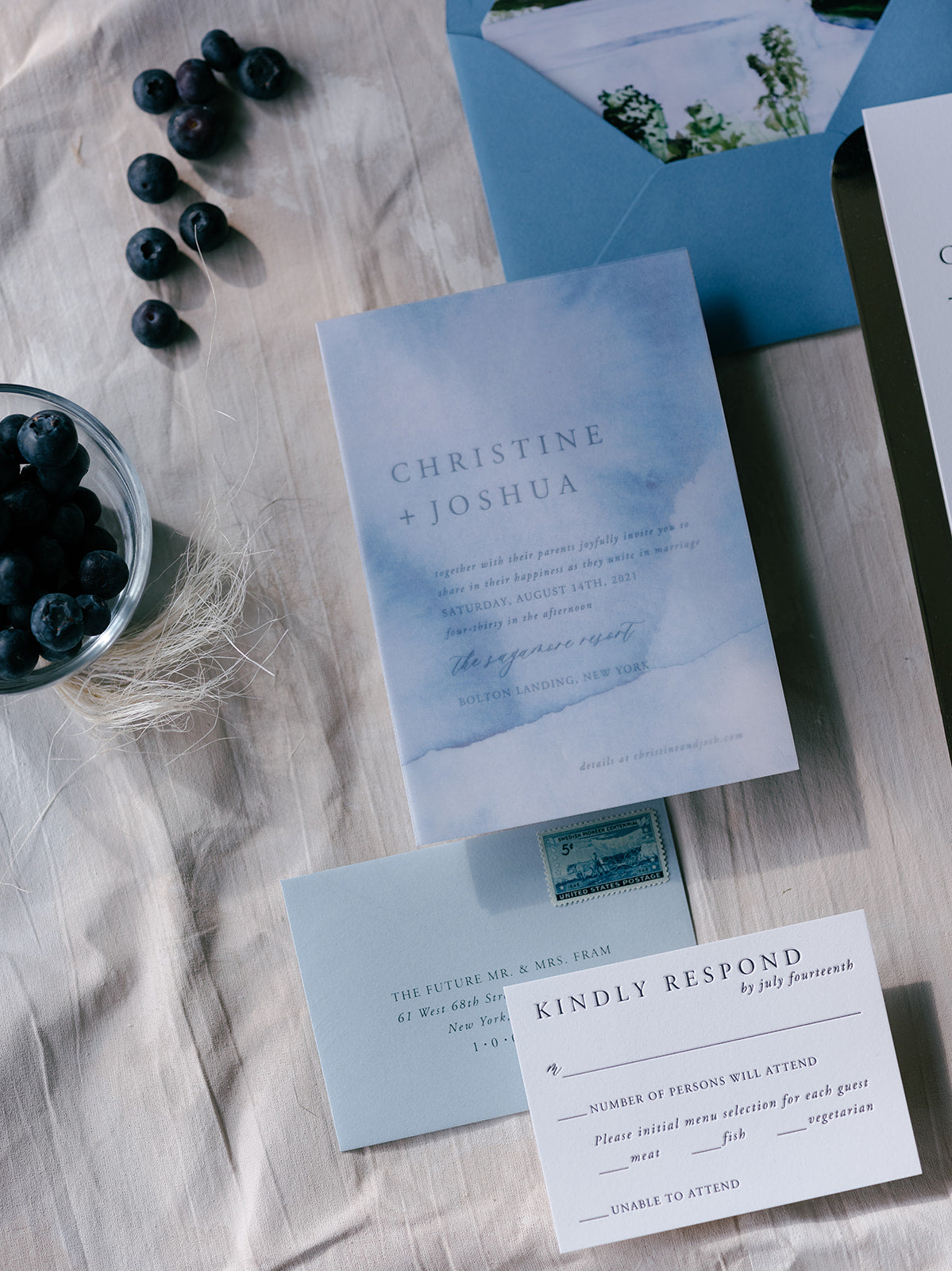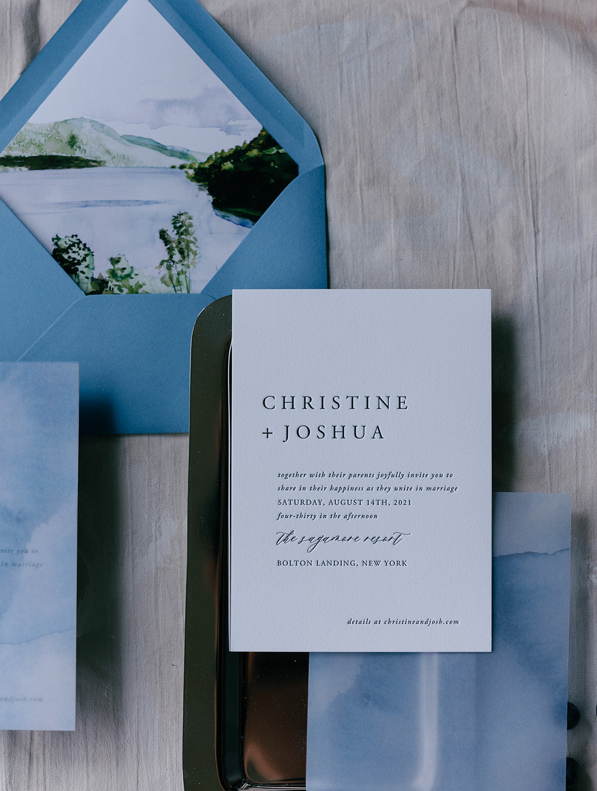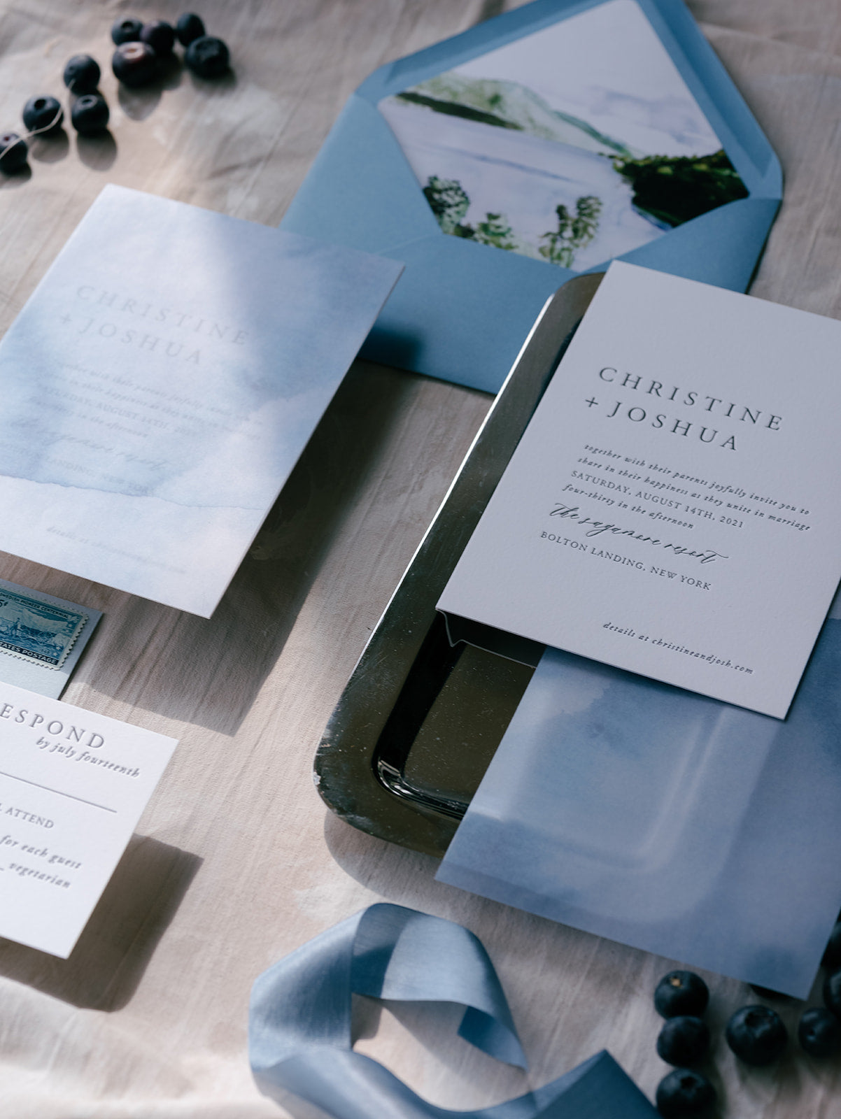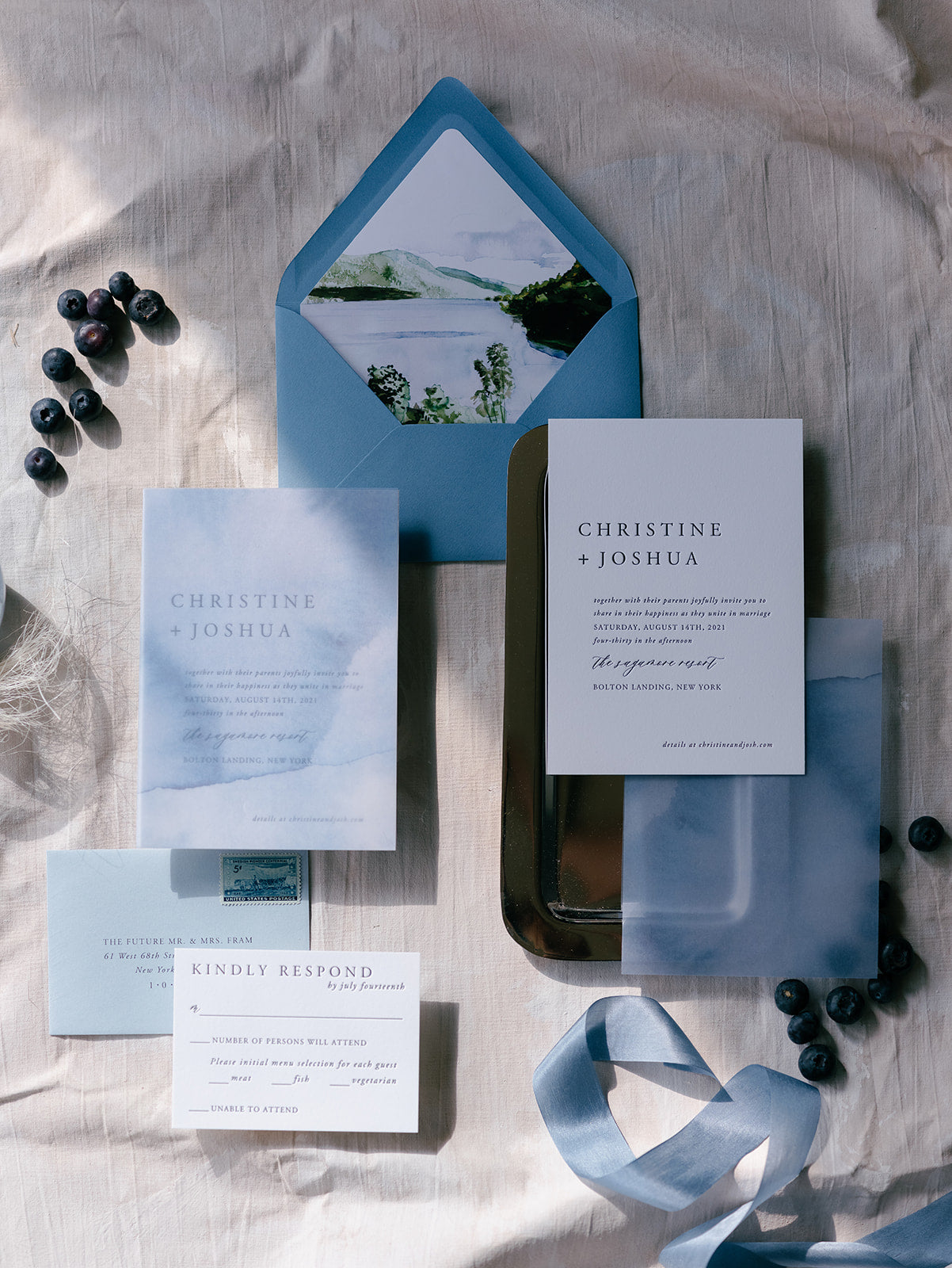 Features: Hand-Painted Envelope Liner, Soft Color Story, Vellum Layering, Rounded Corner Die Cuts, Layered Card Construction, Minimal & Refined Typography, Satin Ribbon Tie, RSVP & Enclosure Cards.