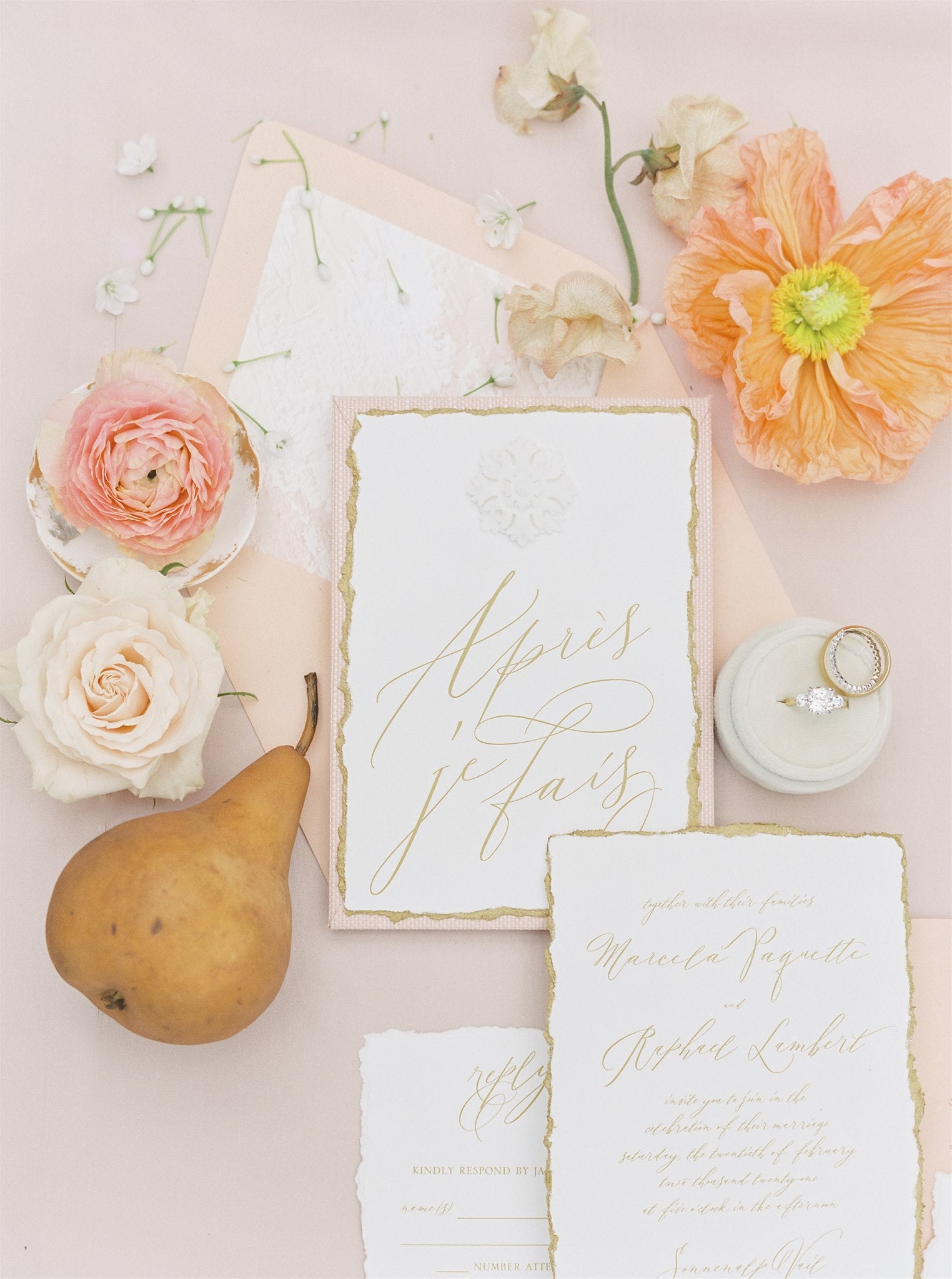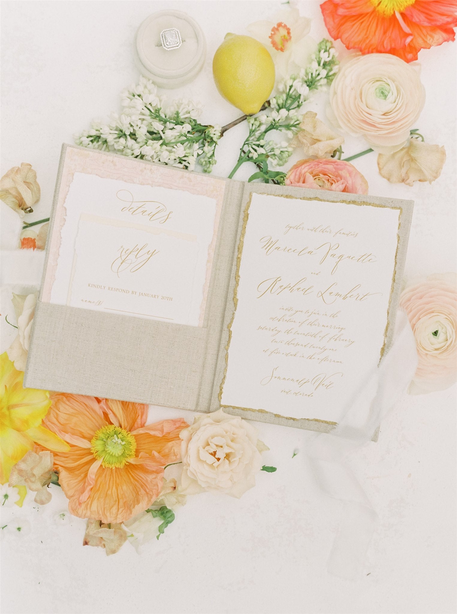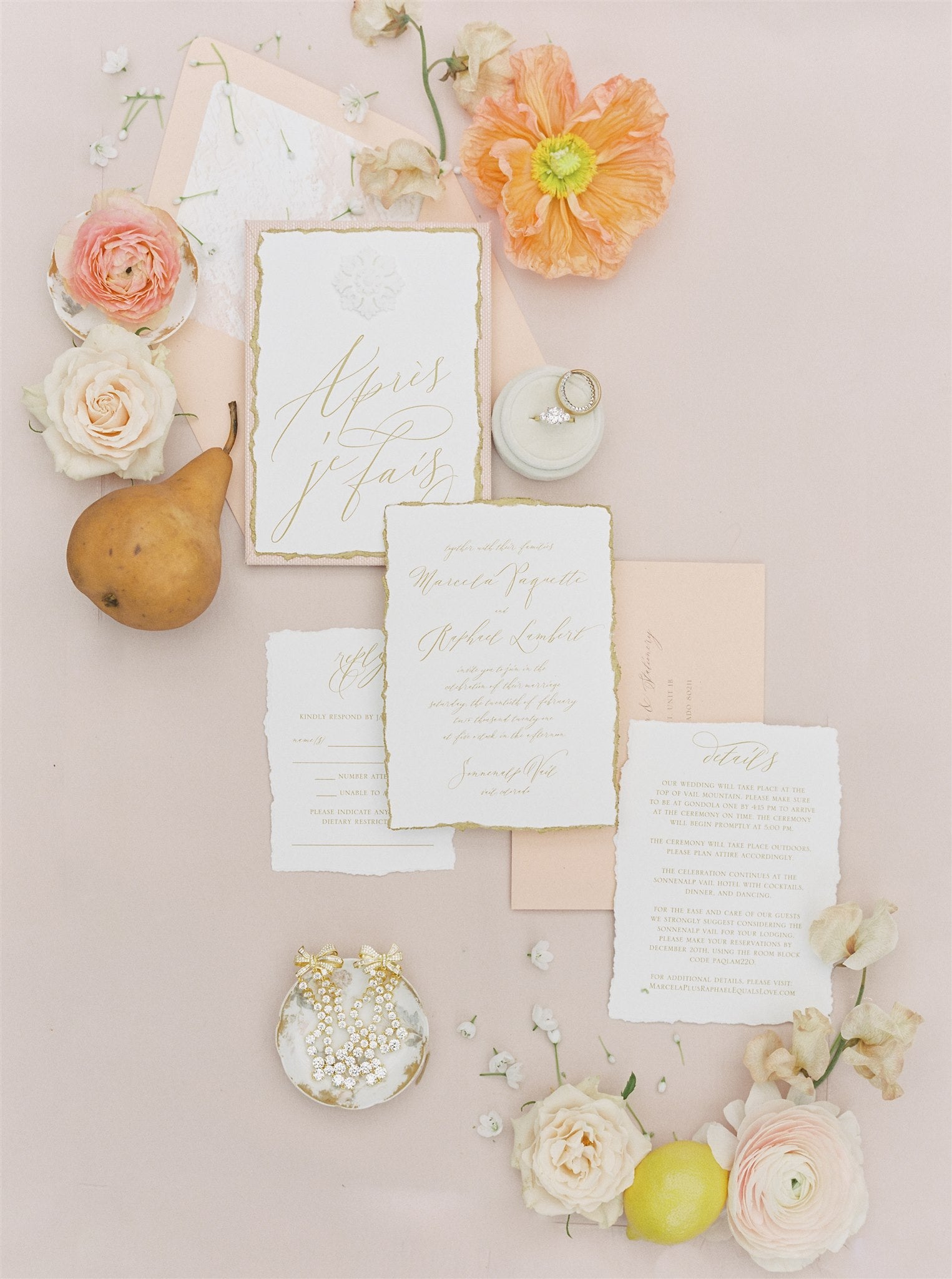 Features: Après Ski Inspired Wedding Stationery Design, Peach & Pastel Fall Color Palette, Fabric Wrapped Folio Invitation, Gold Hand Painted Main Invitation, Enclosure Pocket, Raw Silk Ribbon Accents, Soft Tactile Fabric Textures, Destination Inspired Vail Colorado Styling, Cohesive Ribbon Detailing.