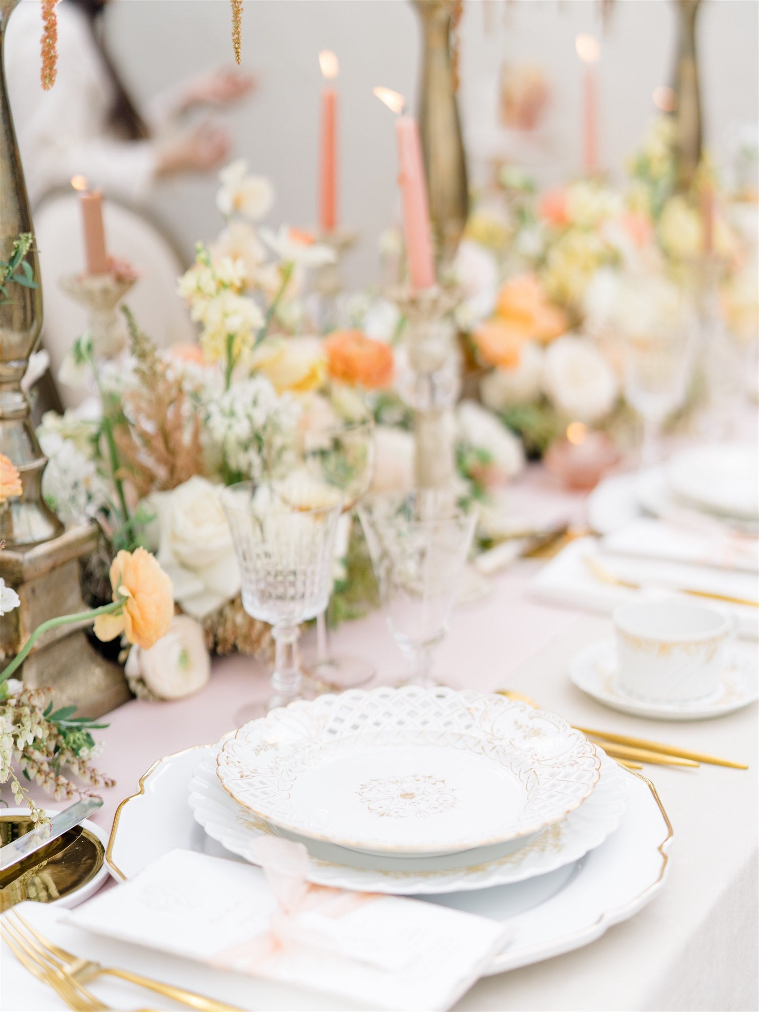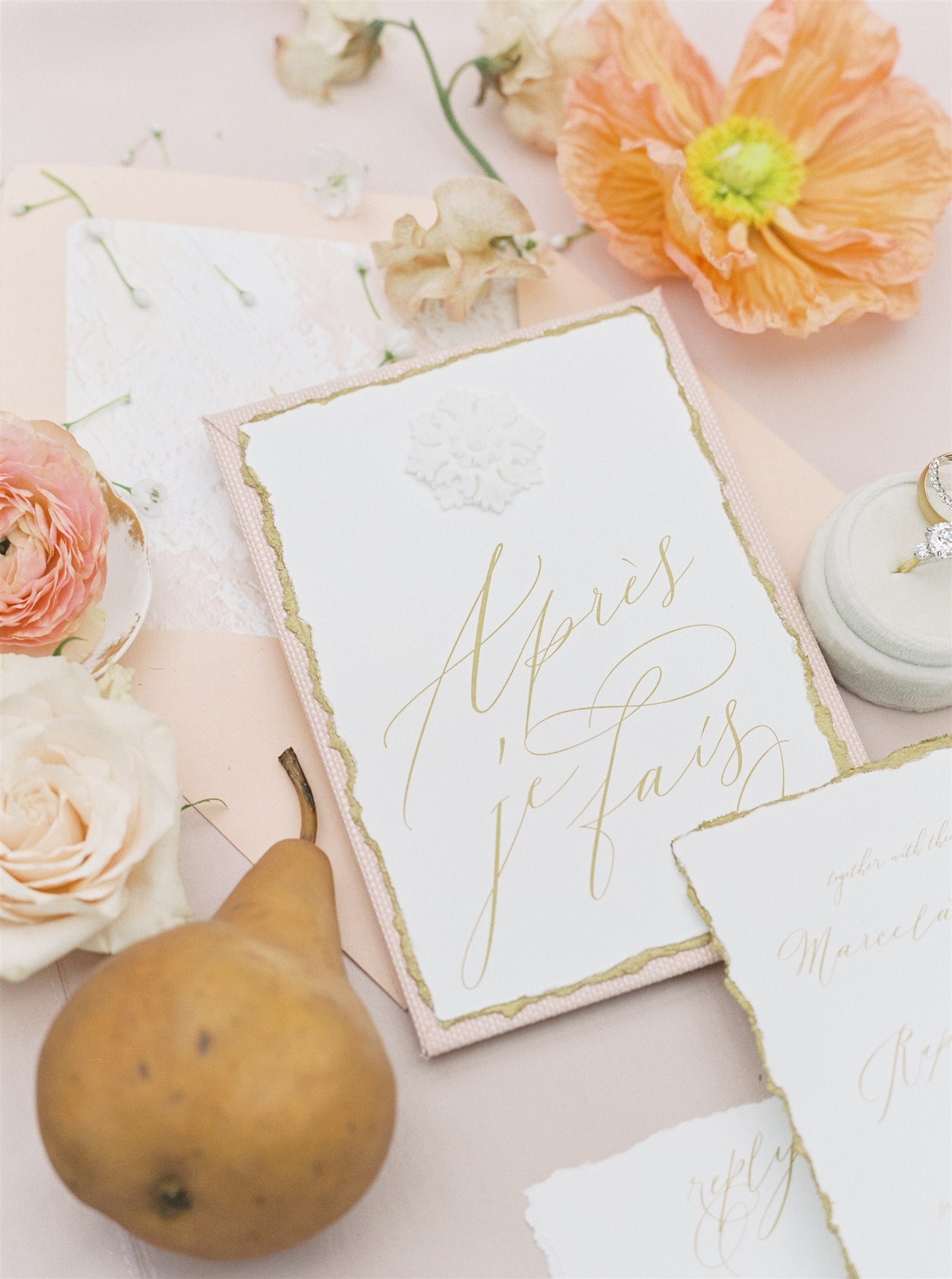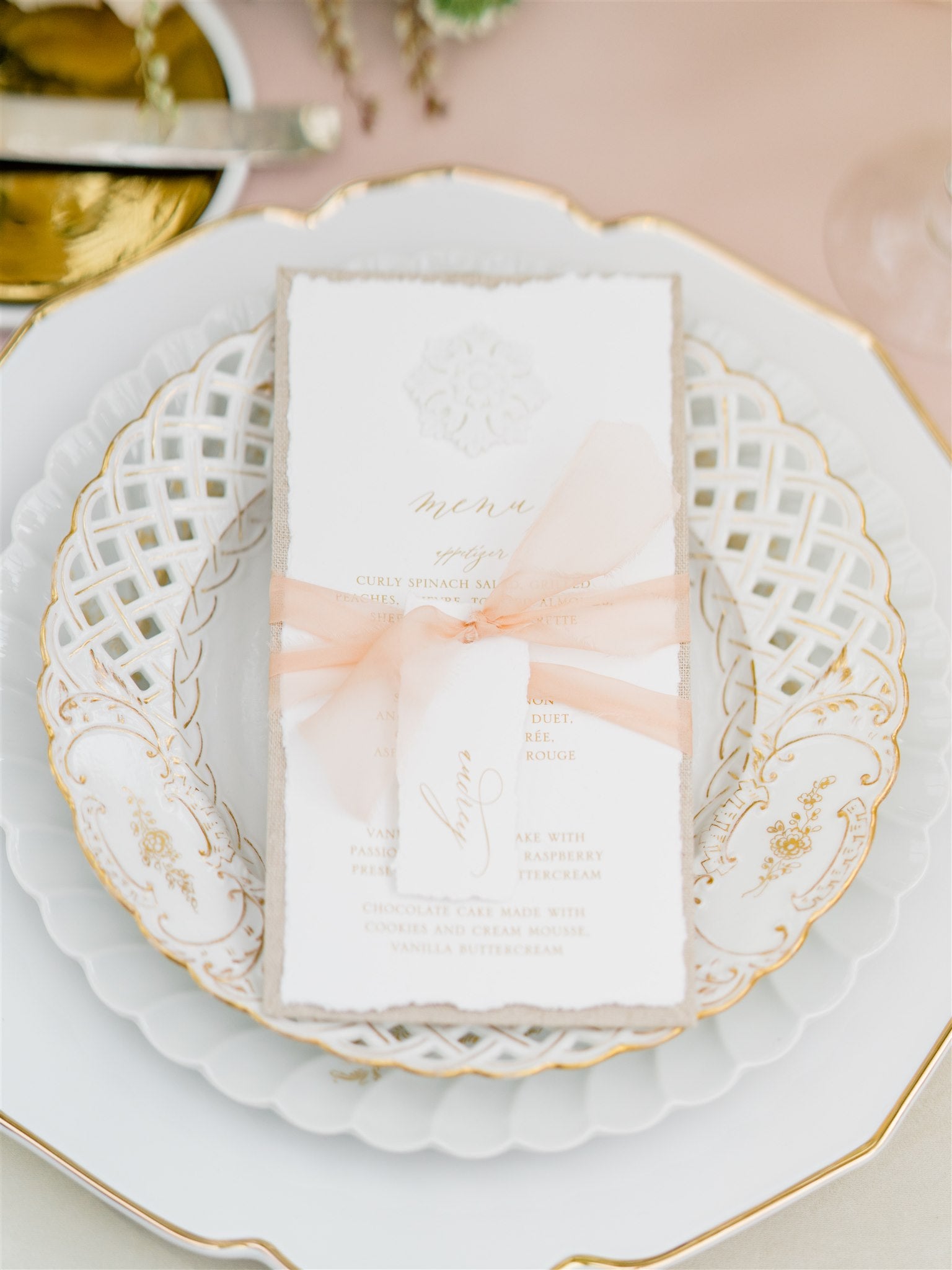 Features: Après Ski Inspired Wedding Stationery Design, Peach & Pastel Fall Color Palette, Fabric Wrapped Folio Invitation, Gold Hand Painted Main Invitation, Enclosure Pocket, Raw Silk Ribbon Accents, Soft Tactile Fabric Textures, Destination Inspired Vail Colorado Styling, Cohesive Ribbon Detailing.