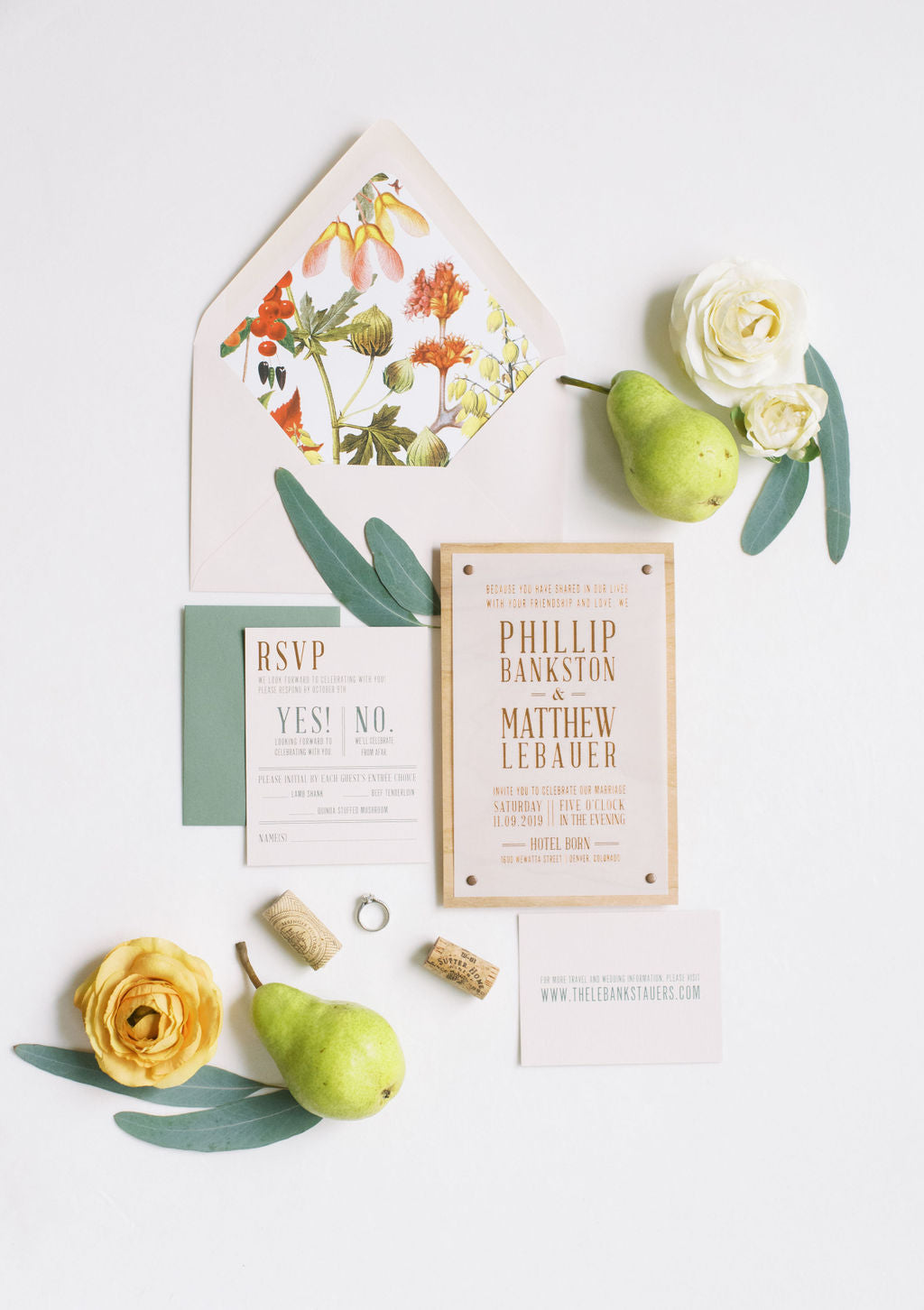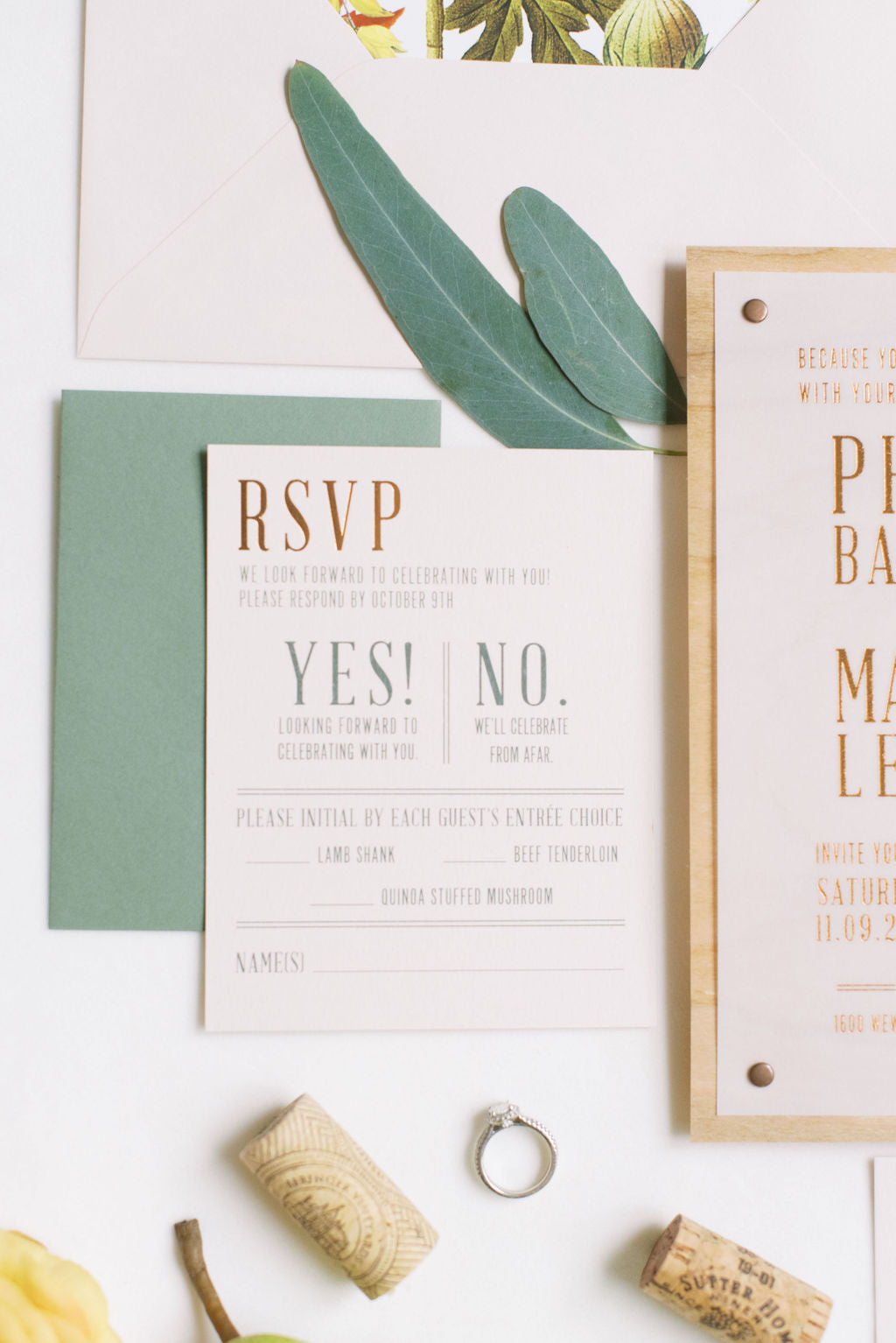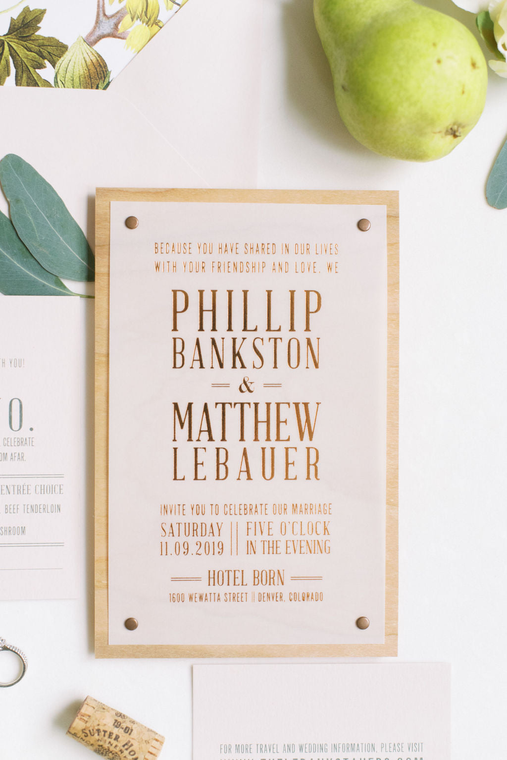 Features: Wood Invites with Brass Rivets, Copper Foil Stamped Translucent Vellum, Fall Foliage Liner