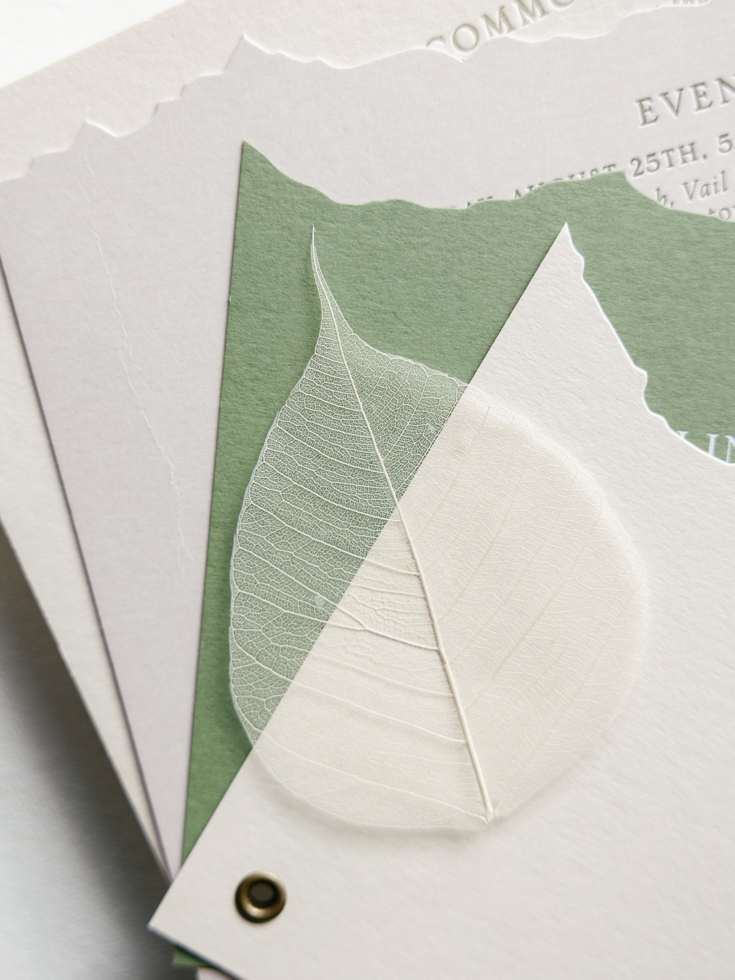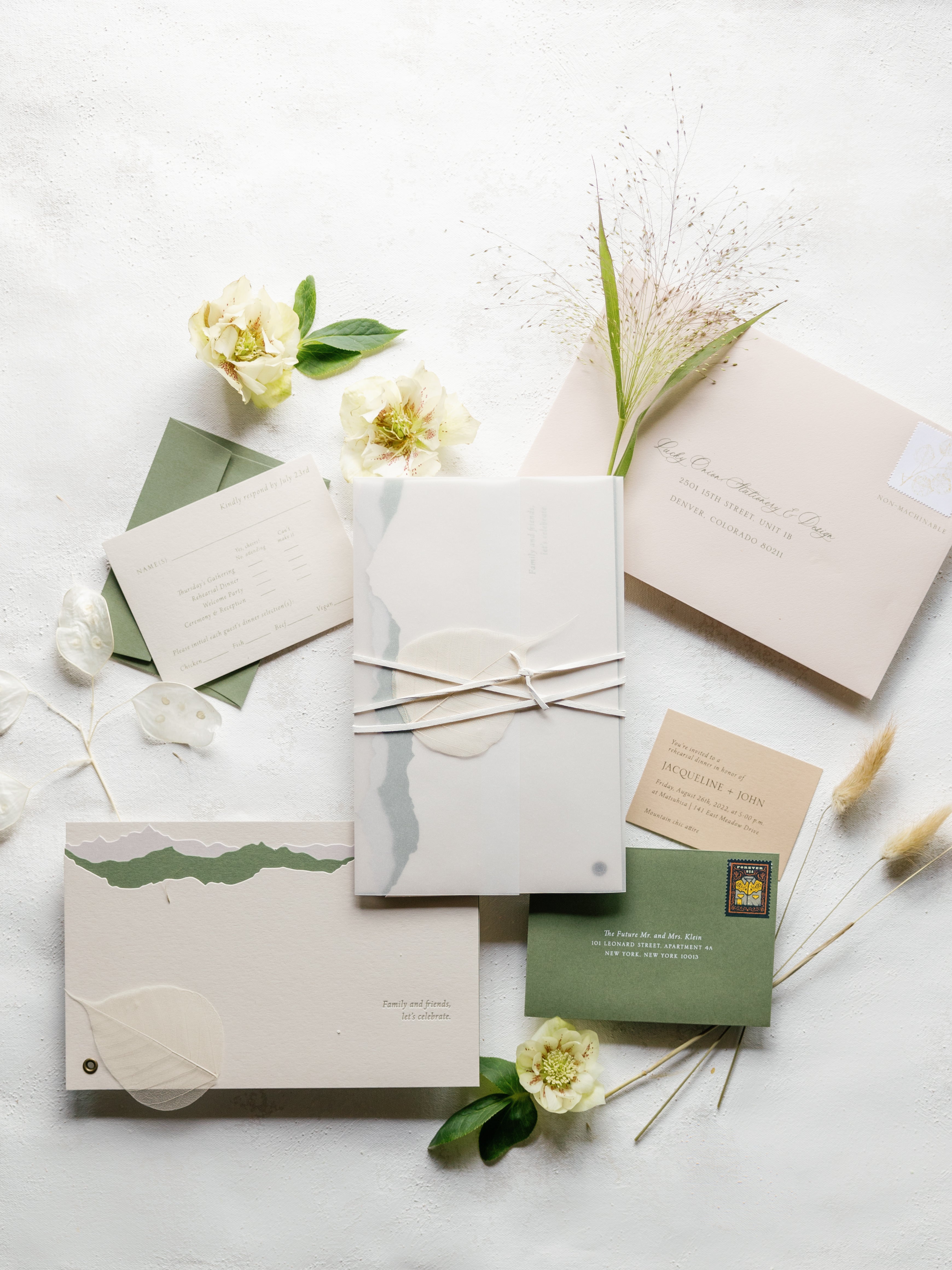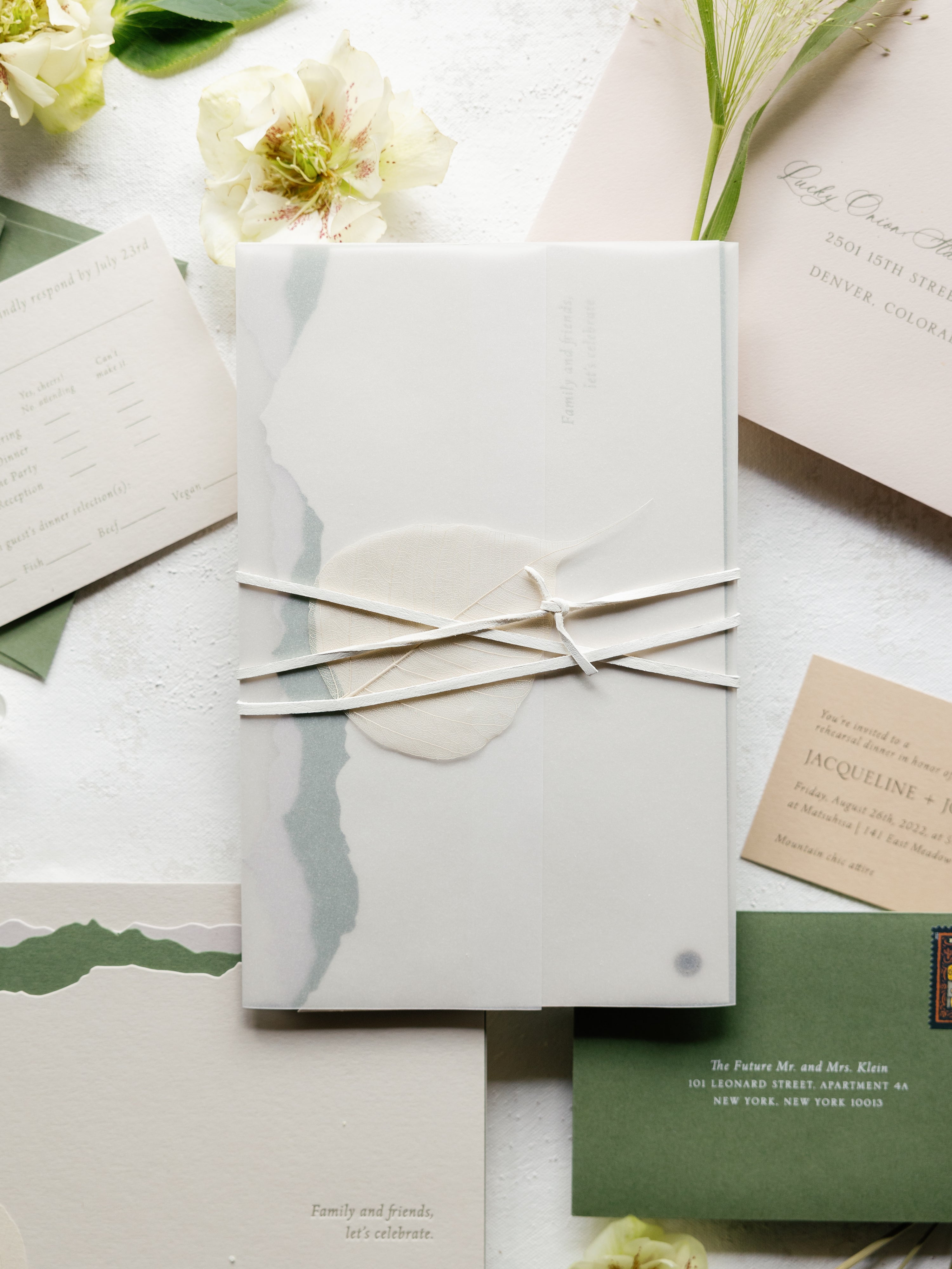 Features: Organic Modern Aesthetic, Soft Neutral & Muted Sage Color Palette with Warm Ivory Tones, Translucent Vellum Wrap with Abstract Watercolor Wash Detailing, Handmade Paper Elements with Subtle Deckled or Torn Edges, Delicate Ribbon Tie Closure, & Blind Deboss or Light Letterpress Printing.