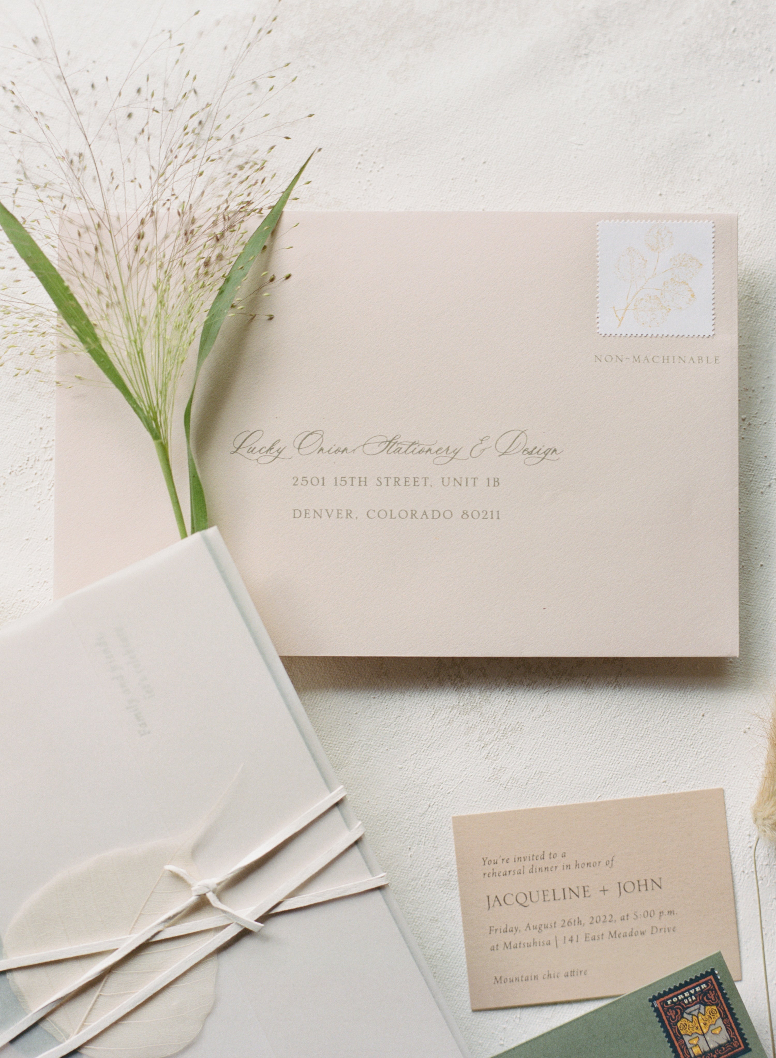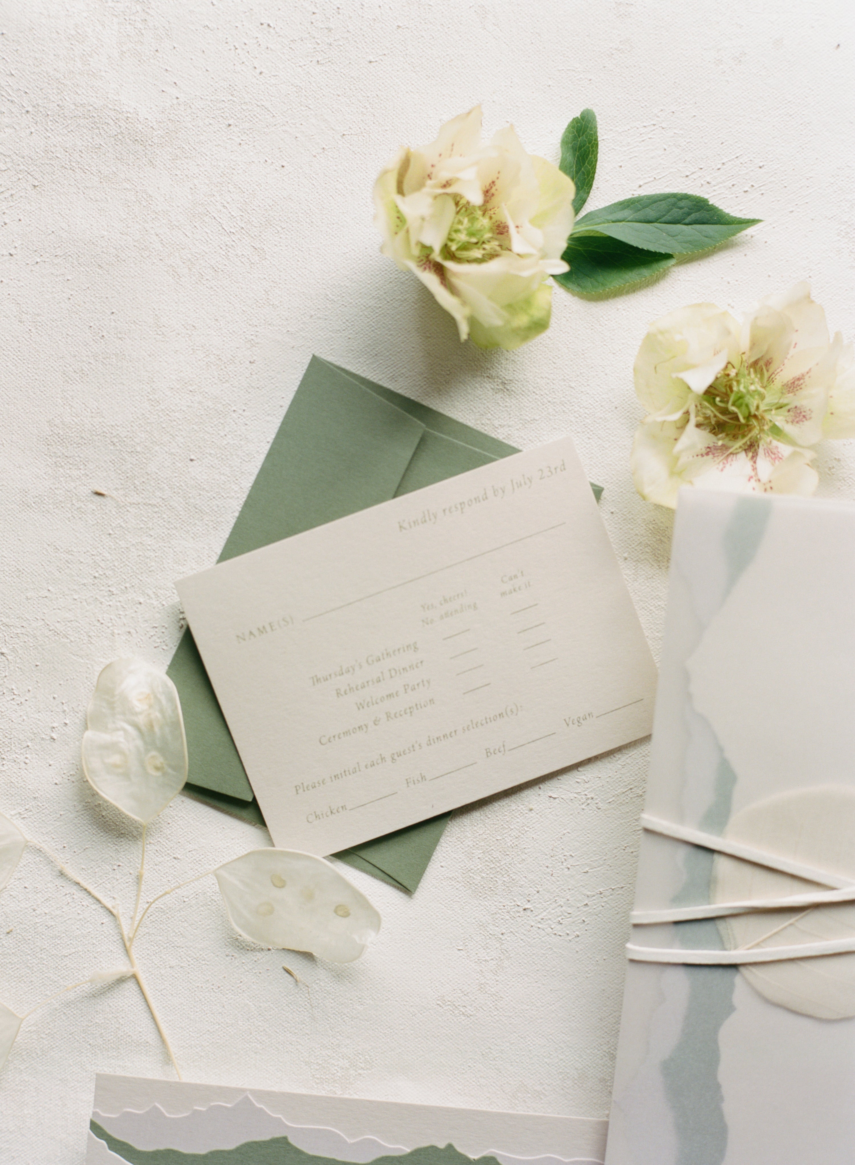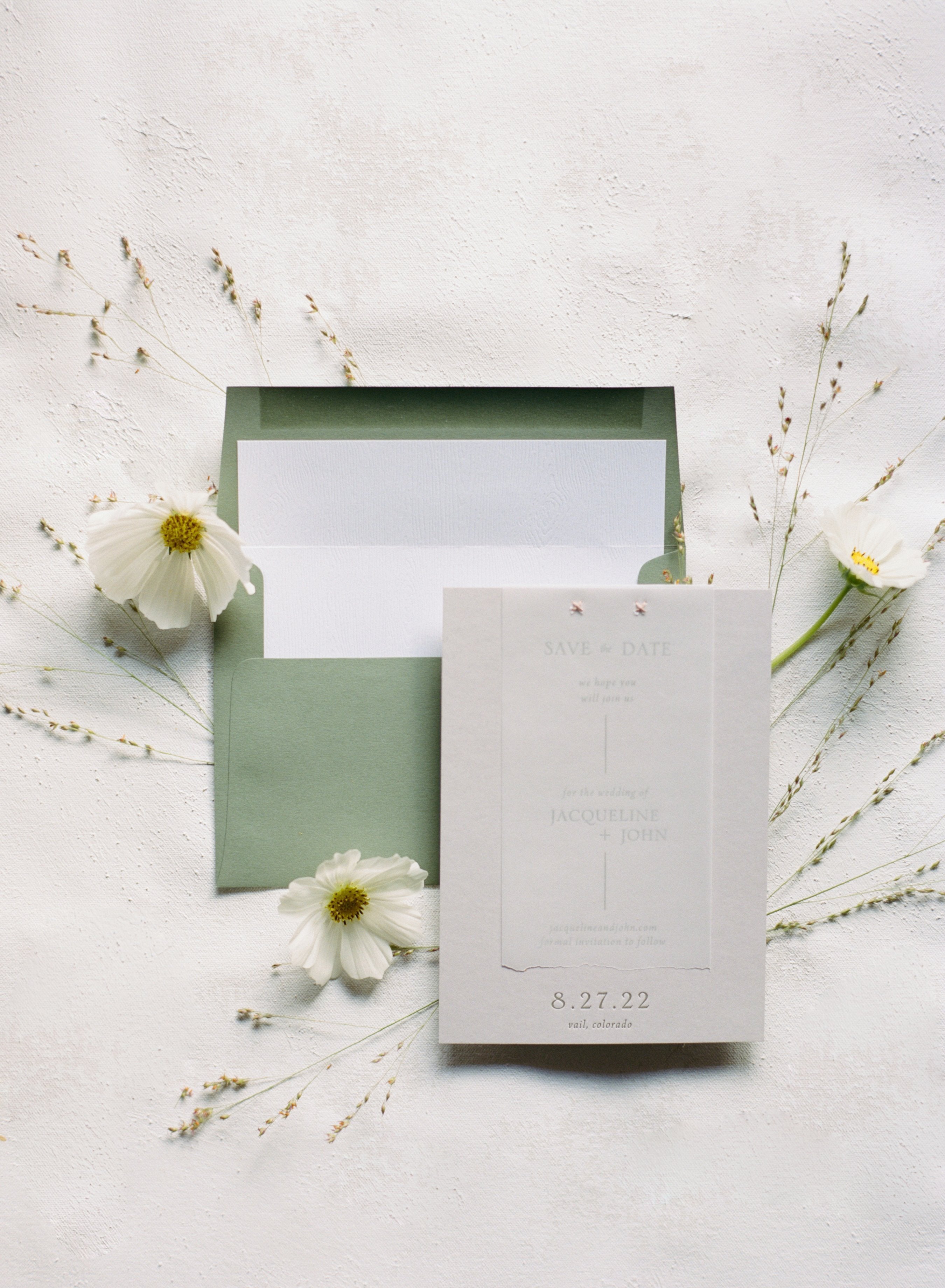 Features: Organic Modern Aesthetic, Soft Neutral & Muted Sage Color Palette with Warm Ivory Tones, Translucent Vellum Wrap with Abstract Watercolor Wash Detailing, Handmade Paper Elements with Subtle Deckled or Torn Edges, Delicate Ribbon Tie Closure, & Blind Deboss or Light Letterpress Printing.
